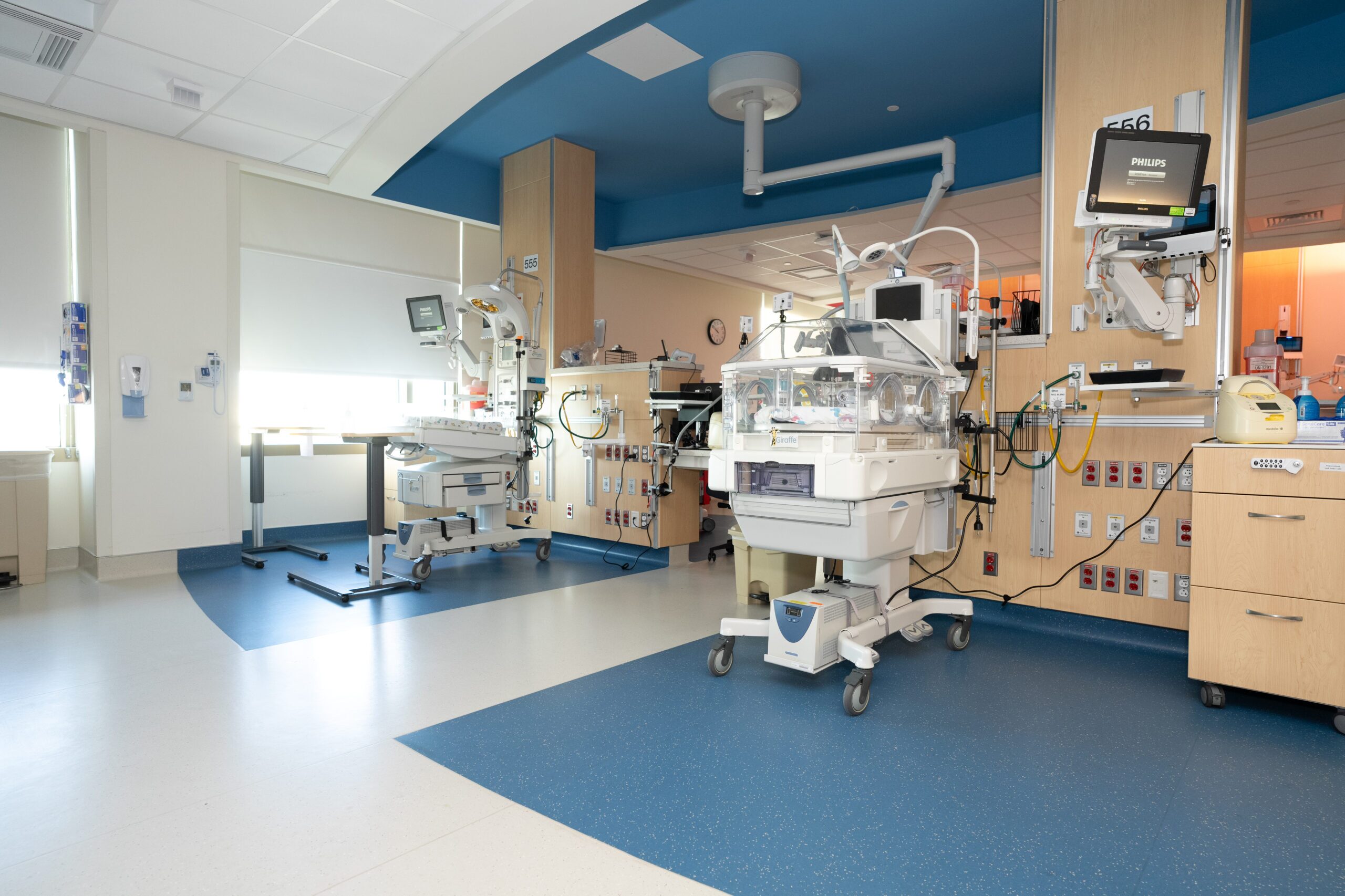 The 26,000-square-foot NICU, located on the fifth floor of Driscoll’s Pavilion, features a hybrid room model designed to enhance specialized care. The unit includes 18 private patient rooms, three twin rooms, and nine four-bed open bay rooms, ensuring a balance of critical care and family-centered comfort.