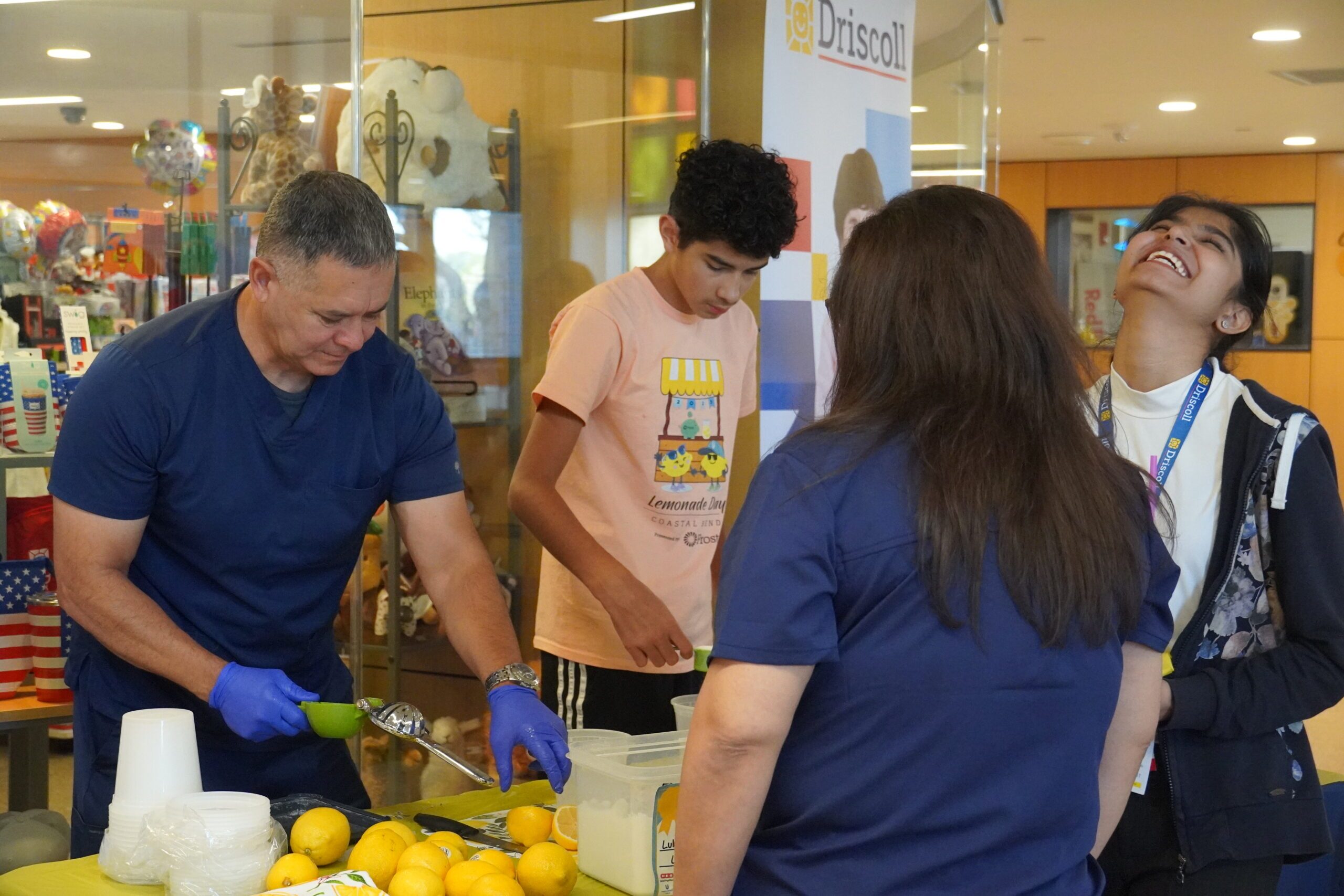 Luke had been admitted with pneumonia and spent four days under the care of Dr. Marshall Leland and RN Jasmine Robledo. After being discharged, Luke raised $500 through his lemonade stand and presented it to the hospital. He also served lemonade to staff and donated an additional $85 in tips. Both caregivers attended the check presentation to see Luke healthy and giving back.