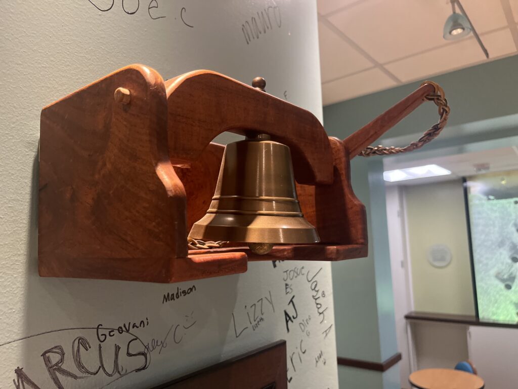 “Your treatment is over. Hurray, hurray. Time for you to recover. You’ve earned the right to ring the bell. So, ring the bell three times now. Your day has come to ring it proudly. Tell the world your treatment is done. And here’s to lots of happy days to come.”