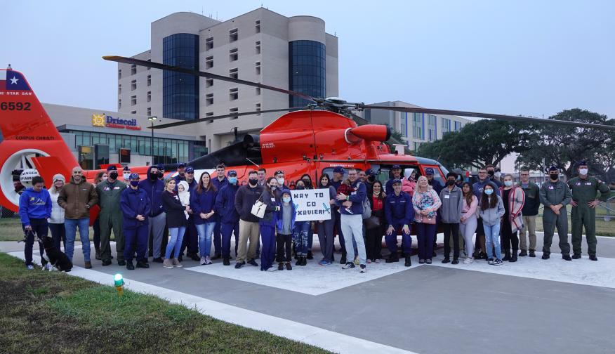 When Xavier and his family walked out of Driscoll Children's Hospital, they were surprised by a group of friends and Coast Guard members waiting to celebrate Xavier’s completion of his treatment. Xavier also got to take a seat inside the helicopter as his father's fellow guardsmen explained how it works.